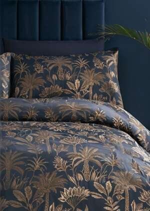 Granatowy, żakardowy zestaw poszewek na kołdrą Soiree Midnight Palm