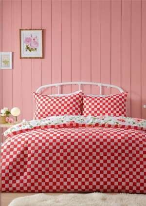 Zestaw dwustronnych poszewek na kołdrą w kolorze różowym, bożonarodzeniowe kokardki i dzwonki