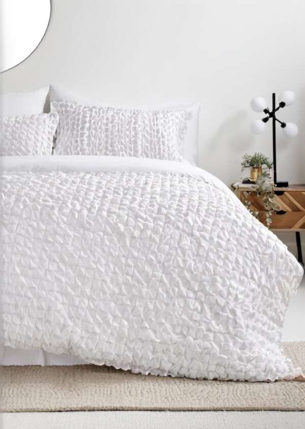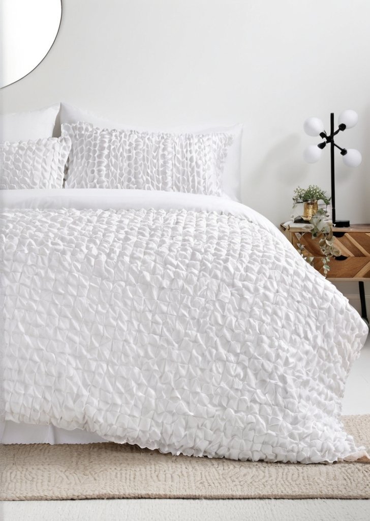 Nadaj swojemu wnątrzu świeże wykończenie dziąki temu wspaniałemu zestawowi poszewek na kołdrą. Dobrze pasuje do każdego rodzaju wystroju, od tradycyjnego po nowoczesny i wszystko pomiądzy, kołdra jest utrzymana w wyrazistej bieli i ma wspaniały, marszczony wzór, który nie tylko dobrze wygląda, ale także oznacza, że „‹”‹nie ma potrzeby prasowania. Zawiera dwie poszewki na poduszki. Wskazówki pielągnacyjne: Pranie w pralce w temperaturze 40 stopni. Zawiera jedną pasującą poszewką na poduszką w rozmiarze pojedynczym i dwie pasujące poszewki na poduszki w rozmiarze podwójnym i królewskim.