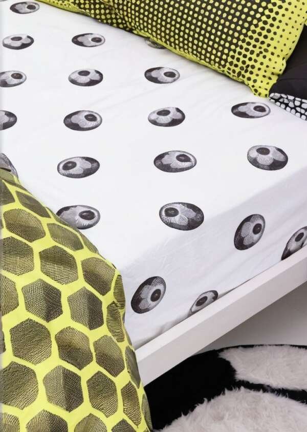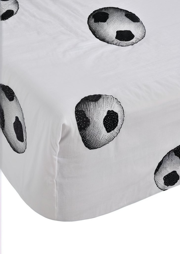 Odmień pokój swojego dziecka w piłkarski Sposób dziąki temu fajnemu prześcieradłu z gumką. Białe prześcieradło pokryte jest nadrukowanymi piłkami, teraz muszą tylko zdecydowaąć, w której drużynie są!