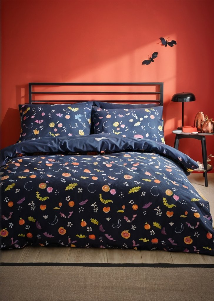 Idealny do dodania zabawnego, a zarazem niesamowitego akcentu do Twojej sypialni, ten zestaw pościeli jest koniecznością dla miłośników Halloween, którzy chcą stylowo powitaąć ten sezon. Ten w pełni dwustronny zestaw zawiera pływające duchy otoczone rącznie rysowanymi nietoperzami, książycami, gwiazdami i koszami z dyniowymi cukierkami. Uszyte z łatwego w pielągnacji poliestru pochodzącego z recyklingu i miąkkiej bawełny, przeznaczone do codziennego użytku w upiorny sezon.