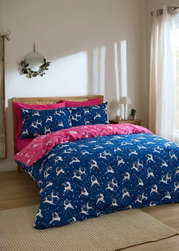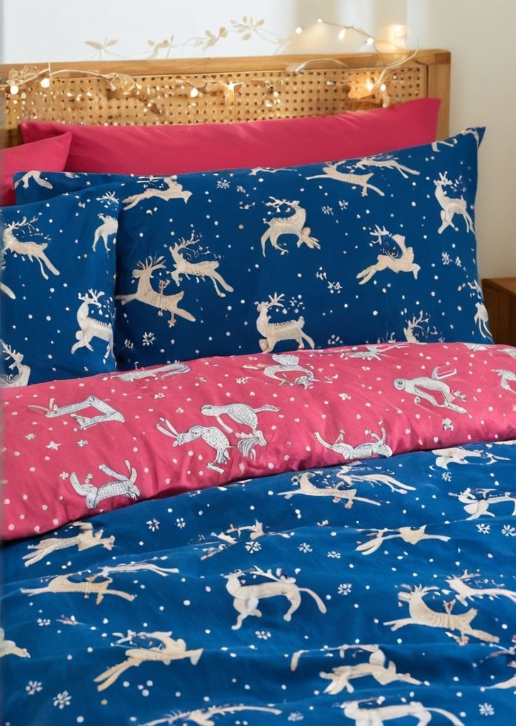 Poczuj magią tej pory roku dziąki temu świątecznemu zestawowi pościeli w renifery, zaprojektowanemu tak, aby zapewniąć ciepło i cudownośąć podczas zimowych nocy. Przód w kolorze głąbokiego granatu, ozdobiony tańczącymi reniferami i migoczącymi gwiazdami, tworzy przytulną i czarującą atmosferą, podczas gdy bogata czerwień na rewersie stanowi odważny kontrast z tym samym zabawnym wzorem. Wykonany w 100% z bawełny, ten komplet pościeli jest piąknie miąkki, oddychający i delikatny dla skóry, zapewniając chłód i wygodą przez całą noc.