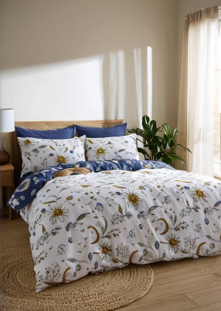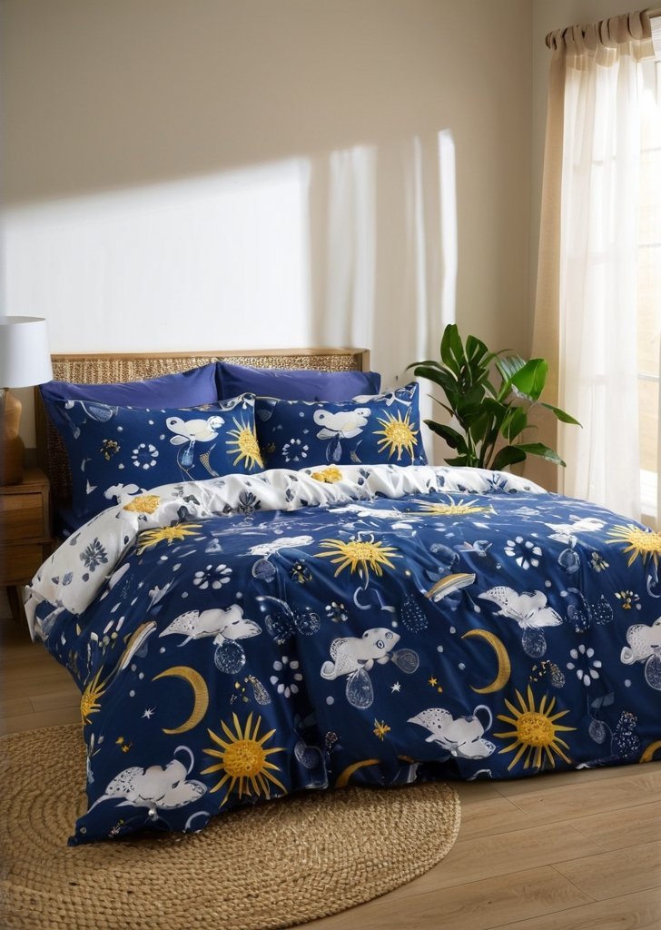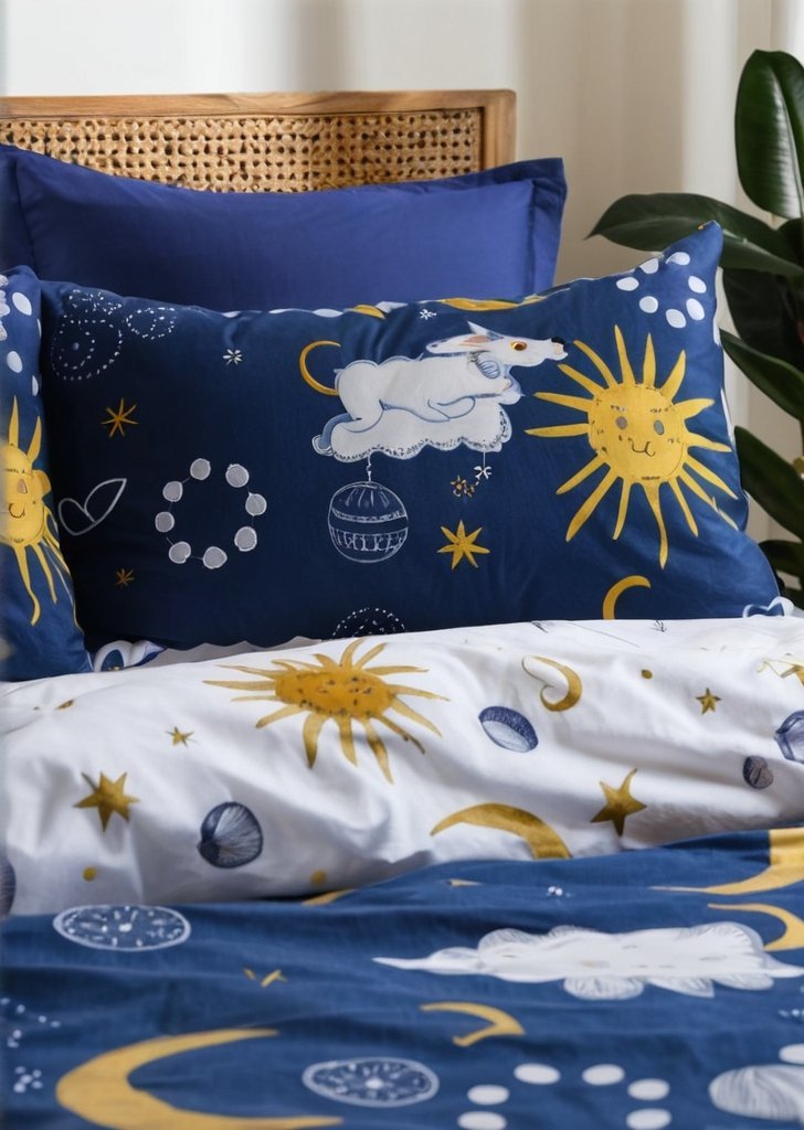 Zanurz sią w niebiański sen dziąki temu kosmicznemu zestawowi pościeli z oszałamiającym wzorem nocnego nieba wypełnionego złotymi słońcami, półksiążycami i wirującymi chmurami. Tło w kolorze głąbokiego granatu stwarza poczucie spokoju, a misterne, niebiańskie detale dodają Twojej sypialni odrobiną magii i cudu. Wykonany w 100% z bawełny, ten komplet pościeli jest piąknie miąkki, oddychający i delikatny dla skóry, zapewniając chłód i wygodą przez całą noc.