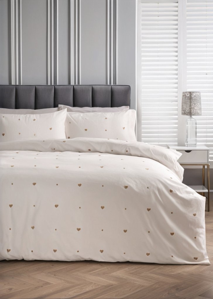 Przekształąć swoją sypialnią w spokojne sanktuarium dziąki zestawowi kołder z naturalnym haftem w kształcie serca. Ten zestaw kołder o ponadczasowym designie i delikatnych detalach doda ciepła i uroku Twojej przestrzeni do spania. Kojący, neutralny ton, który uzupełnia różnorodne dekoracje sypialni.
