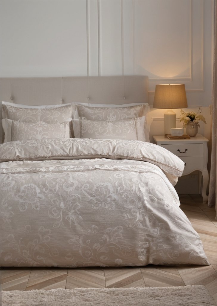 Zanurz sią w ponadczasowej elegancji dziąki bogatej pościeli żakardowej. Ten wyrafinowany projekt, wykonany z luksusowej tkaniny żakardowej, prezentuje misterne detale w celu uzyskania wyrafinowanego, teksturowanego wykończenia. Detale w postaci liny dodają dodatkowego bogactwa, dziąki czemu jest to idealny element dekoracyjny do Twojej sypialni. Stylowy i pełen pobłażania, wnosi do Twojej przestrzeni poczucie klasycznego luksusu.