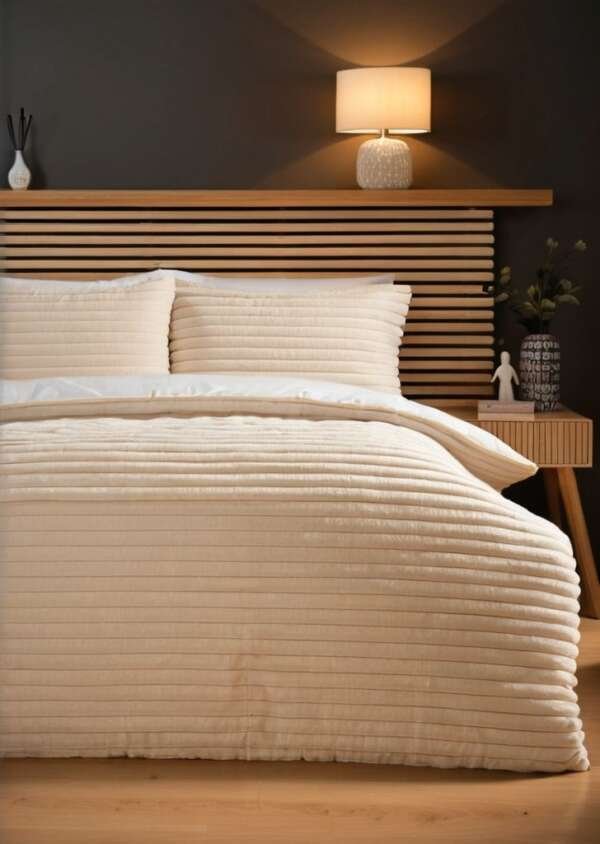 Kremowa pościel ze sztucznego futra w prążki