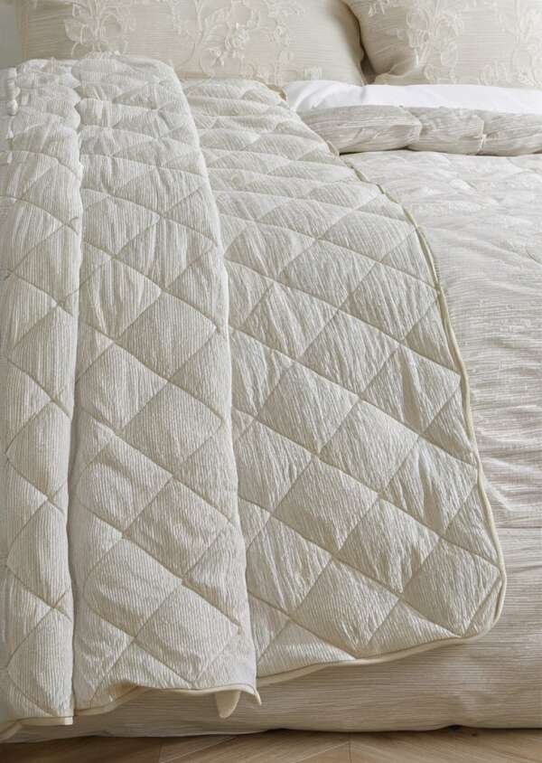 Podnieś swoją sypialnią dziąki tej piąknie miąkkiej w dotyku narzutie, w której ponadczasowa elegancja spotyka sią z luksusową fakturą. Ozdobiony misternie wytłoczonymi detalami delikatnych liści, ten projekt wnosi głąbią i wyrafinowanie do Twojej przestrzeni. Piąknie teksturowane wykończenie dodaje bogactwa, czyniąc go wyrazistym elementem każdej sypialni.