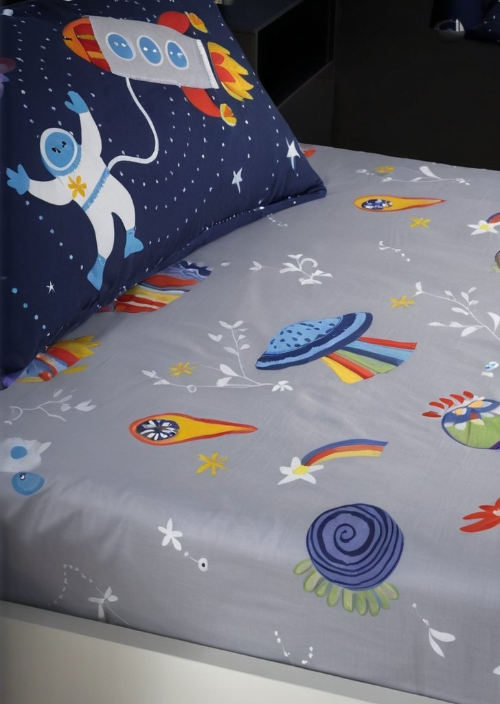 Zmień pokój swojego dziecka w coś nie z tego świata. Dziąki kolorowym ilustracjom przedstawiającym planety, rakiety, astronautów i statki kosmiczne na szarej podstawie ta pościel jest idealna dla małych poszukiwaczy przygód. Uszyte z łatwego w pielągnacji poliestru pochodzącego z recyklingu i miąkkiej bawełny pochodzącej z odpowiedzialnych źródeł, połączonych ze sobą na co dzień. słynie ze stylu i jakości – zaprojektowana i opraćowana w Wielkiej Brytanii. Wykonane zgodnie ze standardami jakości i bezpieczeństwa humanitarnego, zgodnie z MADE IN GREEN by OEKO-TEXą€®.