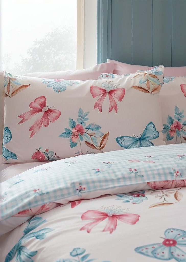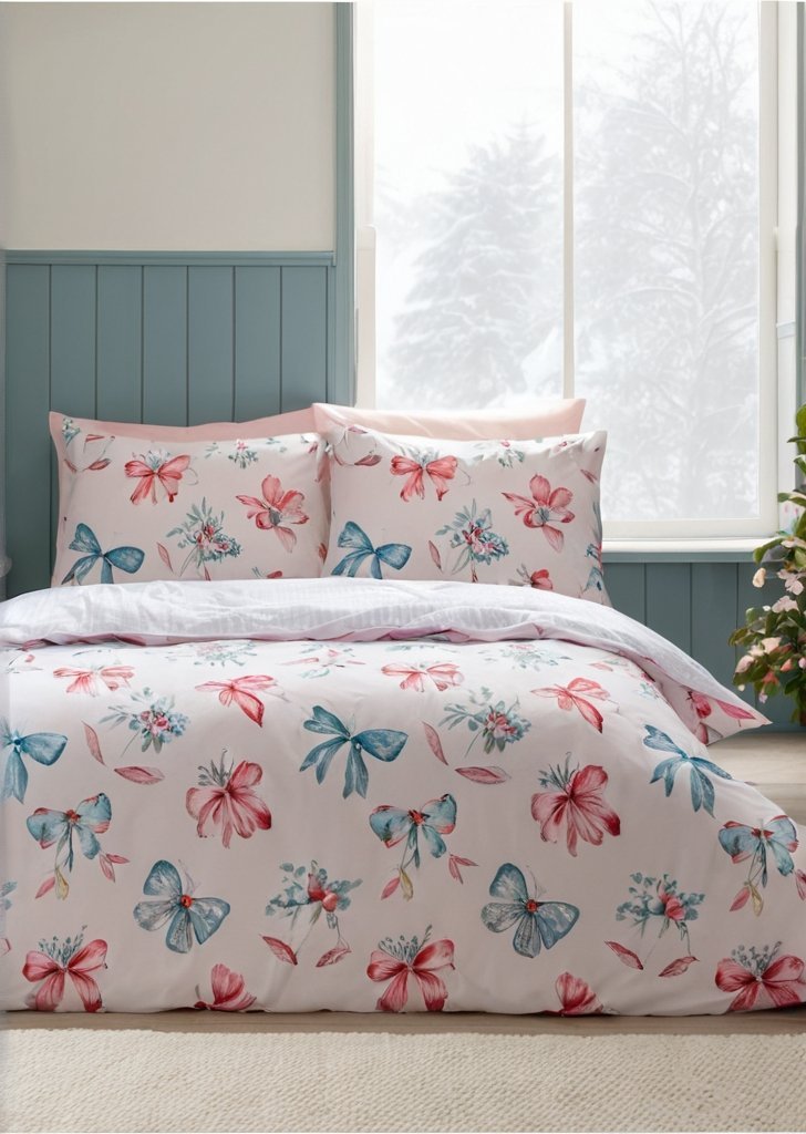 Dodaj odrobiną elegancji do swojego świątecznego wystroju dziąki pościeli Christmas Bows and Bells. Ten uroczy wzór, ozdobiony delikatnymi wstążkami, dzwoneczkami i gałązkami ostrokrzewu w delikatnych pastelowych odcieniach, wprowadzi do Twojej sypialni kapryśną, wakacyjną atmosferą. Uszyte z łatwego w pielągnacji poliestru pochodzącego z recyklingu i miąkkiej bawełny, przeznaczone do codziennego użytku w okresie świątecznym.