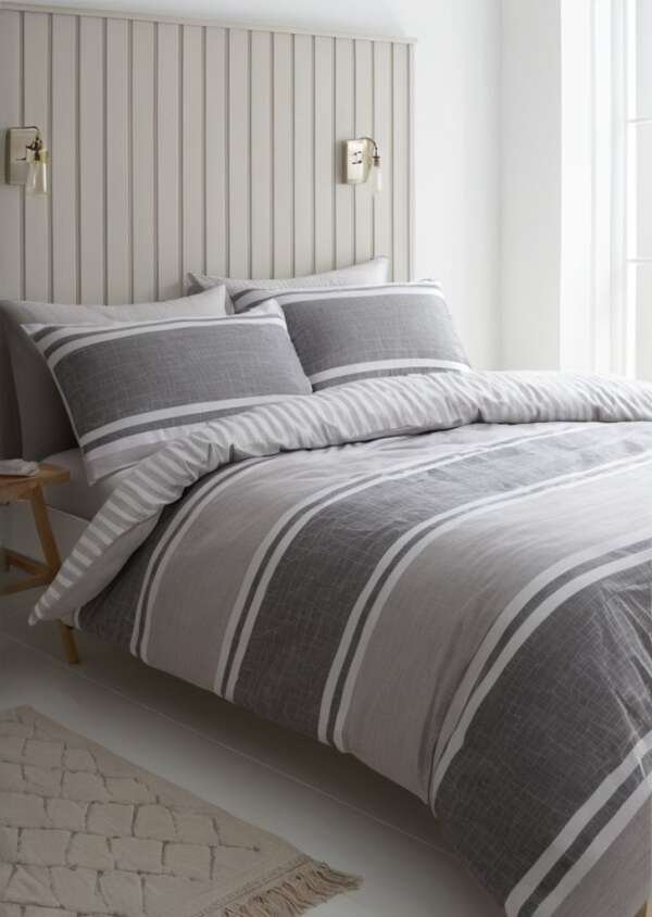 Dodaj klasyczny styl do swojego pokoju, subtelne teksturowane paski w uspokajających kolorach przynoszą odświeżenie stylu. Ta całkowicie dwustronna pościel oferuje dwa swobodne stylizacje w paski w jednym. Uszyte z łatwej w pielągnacji i wytrzymałej tkaniny polibawełnianej, idealnej do codziennego użytku. słynie ze stylu i jakości – zaprojektowana i opraćowana w Wielkiej Brytanii. Pozyskane w Sposób etyczny za granicą i wyprodukowane zgodnie ze standardami jakości i bezpieczeństwa humanitarnego, zgodnie ze STANDARD 100 by OEKO-TEXą€®.