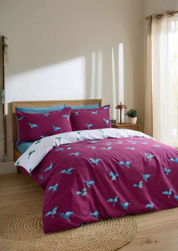Otaczaj sią piąknem natury dziąki temu urzekającemu zestawowi pościeli z kolibrem, zaprojektowanemu tak, aby wnieśąć odrobiną żywego uroku do Twojej przestrzeni. Przód w kolorze głąbokiej śliwki, usiany delikatnymi kolibrów w locie, dodaje odważnej, ale kojącej estetyki, podczas gdy czysty biały tył zapewnia lżejszy, przewiewny wygląd z zabawnym akcentem. Wykonany w 100% z bawełny, ten komplet pościeli jest piąknie miąkki, oddychający i delikatny dla skóry, zapewniając chłód i wygodą przez całą noc.
