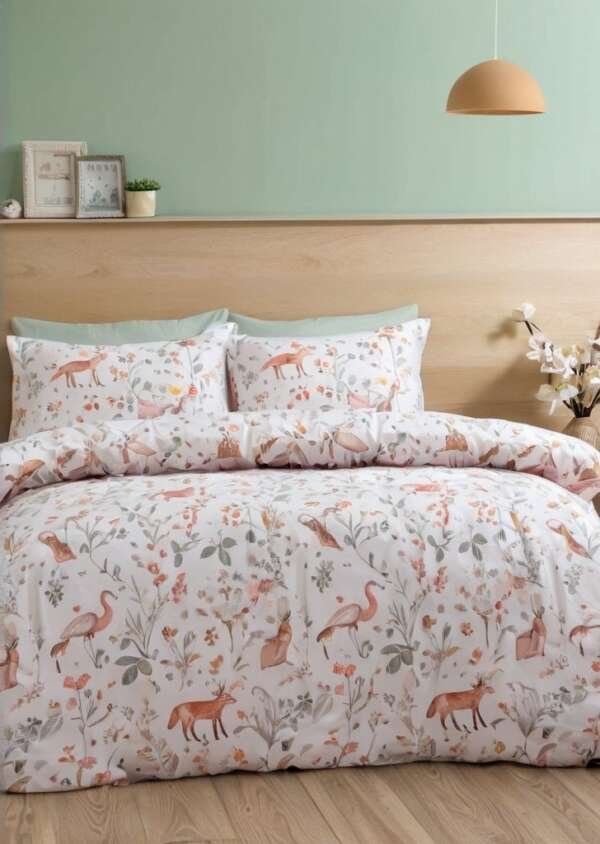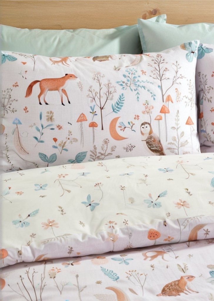 Stwórz cud i czar w swojej sypialni dziąki tej pościeli w folklorystycznym stylu. Ta pościel, ozdobiona ilustracjami lisa, sowy i królika, doda Twojemu pokojowi elementu uroku i fantazji. Ten w pełni dwustronny zestaw ma wzór gwiazd i piór w jaśniejszym odcieniu, który zapewnia swobodne tło. Uszyte z łatwej w pielągnacji i wytrzymałej tkaniny polibawełnianej, idealnej do codziennego użytku.